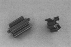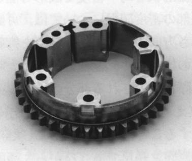 本制品是用于對應(yīng)無聲鏈的可變閥結(jié)構(gòu),要求齒部的高耐壓耐磨性與高尺寸精度的部件。鏈輪齒的齒部是特殊剖面輪廓,是歷來的齒面制造法所無法適用的,為了與此相對應(yīng),僅采用成形,實(shí)現(xiàn)了7.3g/cm3的密度。