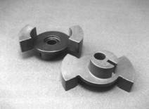 本開發(fā)中,進(jìn)行了以提高精度與大幅度降低成本為目標(biāo)的燒結(jié)研究,對于扇形突起部之間的角度精度要求±0.5°,通過減小法蘭的緣厚,防止了裂紋的發(fā)生與由于密度差所引起的燒結(jié)后尺寸精度的下降,僅對角度精度必要的部分進(jìn)行特殊處理,突起部形狀上進(jìn)行沖壓一體化,由此實(shí)現(xiàn)了高精度。而且,對部件形狀功能上不必要的部分進(jìn)行了削減,實(shí)現(xiàn)了輕量化,考慮到確保材料燒結(jié)后的強(qiáng)度與尺寸精度,選擇了Fe-Cu-Ni-Mo-C體系。與歷來的鍛件相比,實(shí)現(xiàn)了制品重量減輕25%。通過采用低價(jià)的表面處理,進(jìn)而降低了成本50%。
